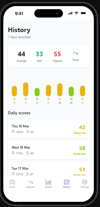 Our app assesses several differents metrics to provide a score regarding your phone usage, it is based on application usage (TikTok count differently from Maps), unlocks, time per session and many more!